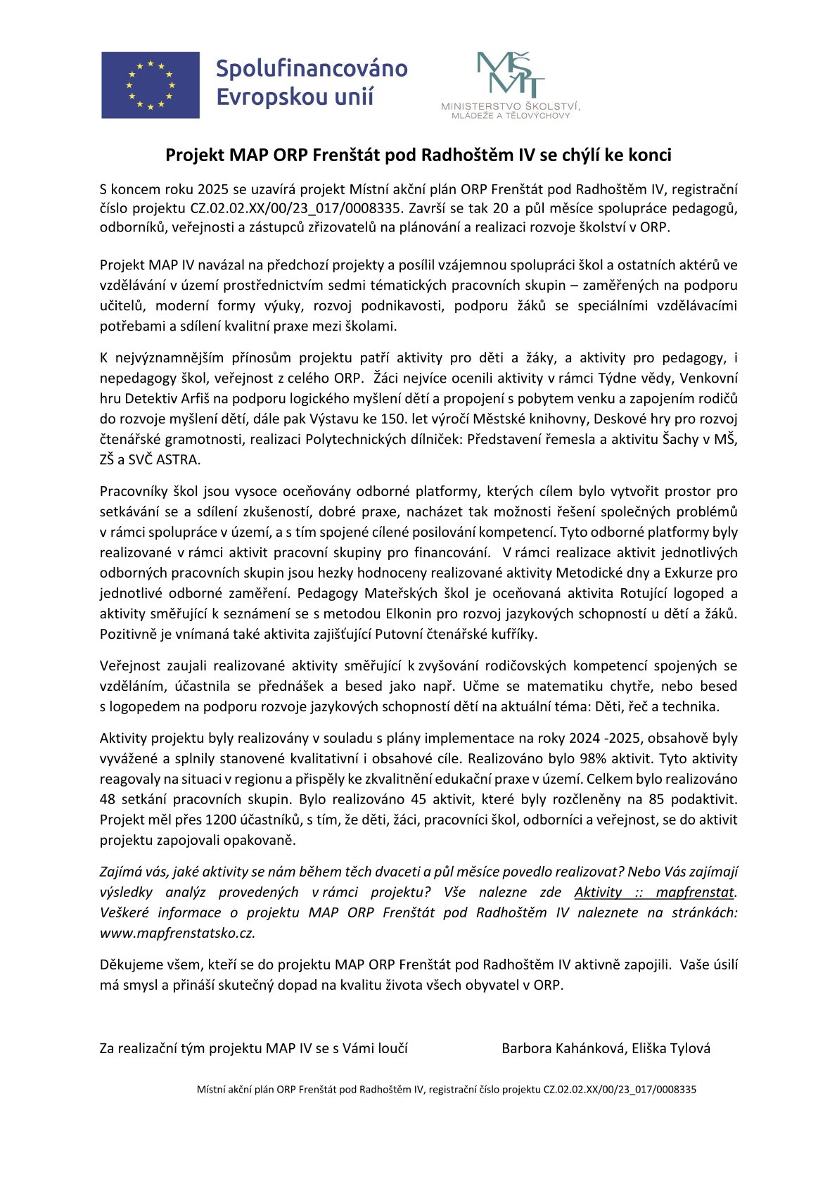 Projekt MAP ORP Frenštát pod Radhoštěm IV je spolufinancován Evropskou unií.