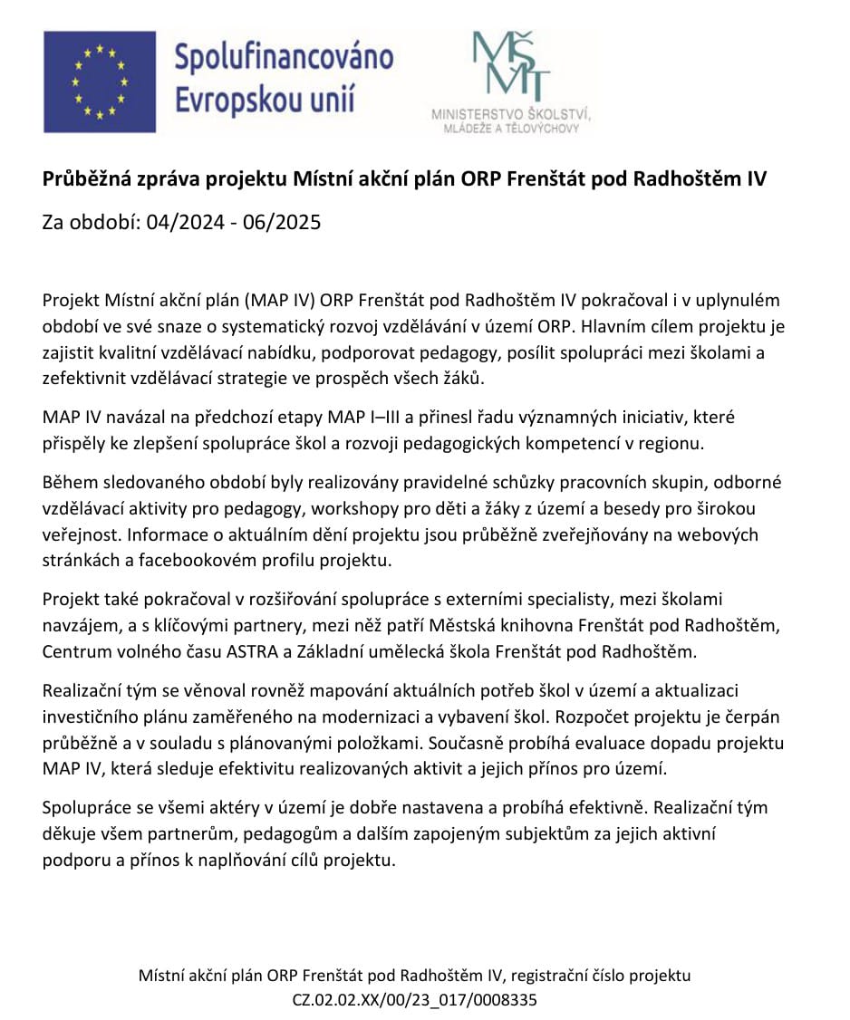 Realizované aktivity projektu Místní akční plán ORP Frenštát pod Radhoštěm IV, registrační číslo projektu CZ.02.02.XX/00/23_017/0008335 k 31.12.2025